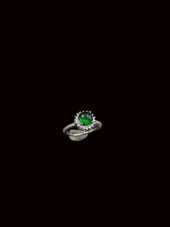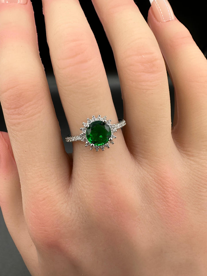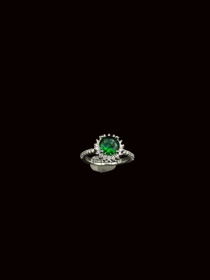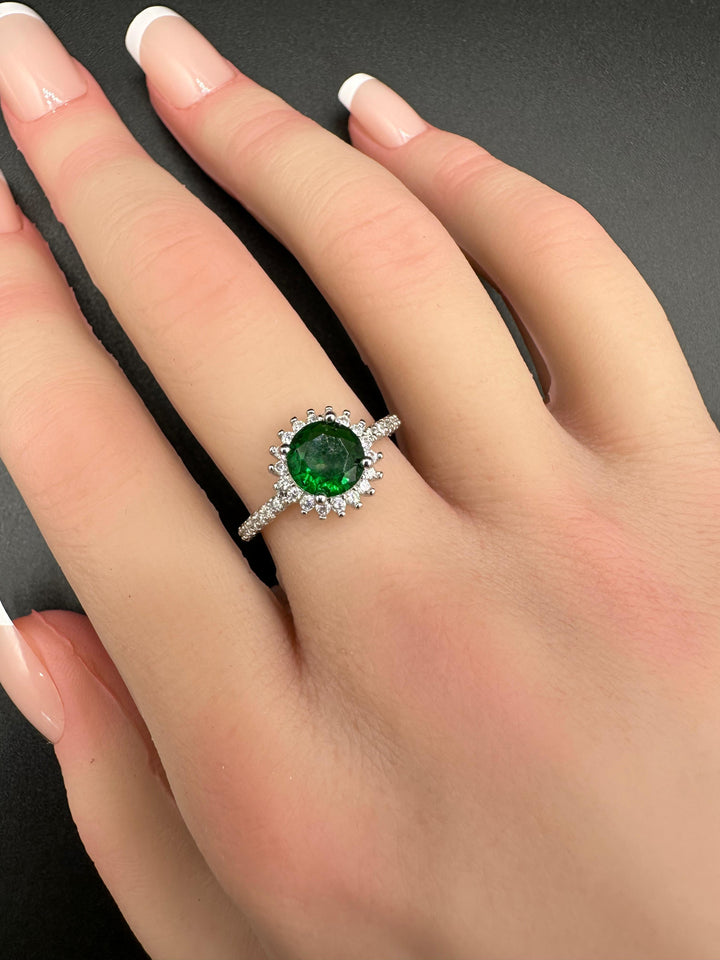 Exude timeless sophistication with our Emerald Halo Diamond Ring, designed to captivate with its rich green brilliance. At the center sits a vivid oval-cut emerald, radiating natural elegance and luxury. Surrounding the gemstone is a halo of sparkling white diamonds, further enhancing its beauty with a dazzling contrast.