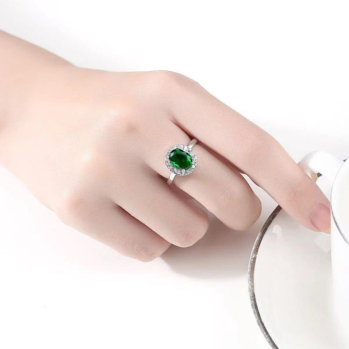 Elevate your style with this striking Emerald Halo Ring, featuring a vivid oval-cut green gemstone as its centerpiece. The lush green stone is beautifully encircled by a halo of sparkling white crystals, enhancing its brilliance and sophistication. Set in a sleek silver-toned band, this ring blends timeless charm with modern elegance.