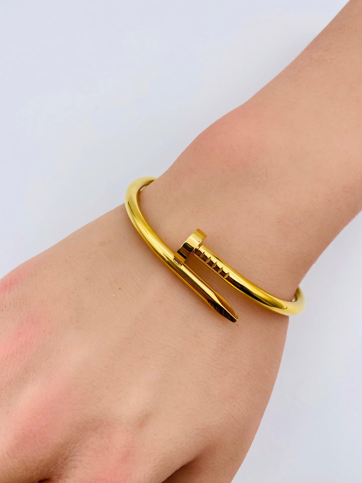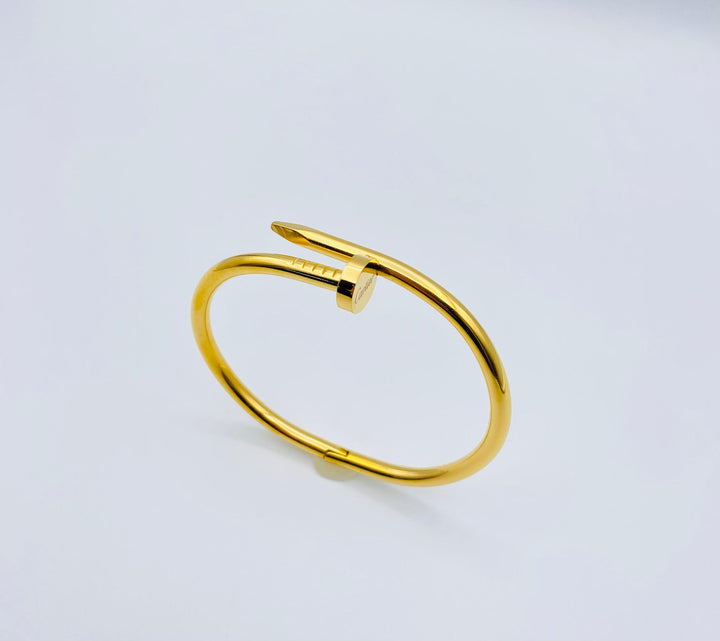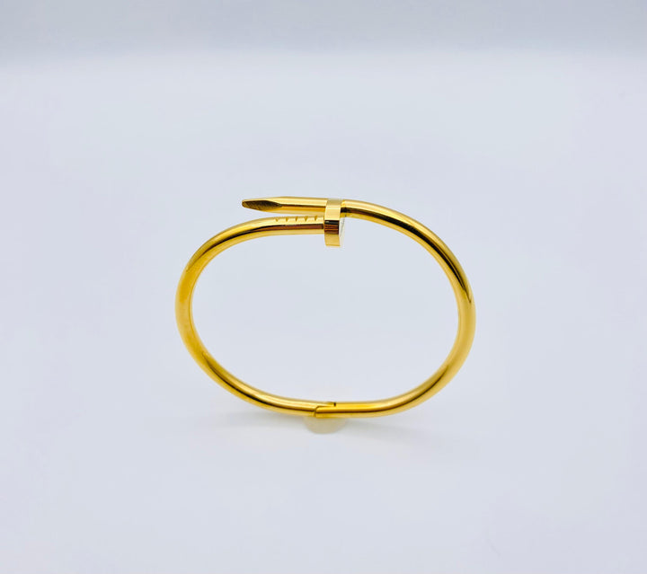 A bold statement piece with a contemporary twist, this gold nail-inspired bracelet perfectly blends minimalism with edge. Designed with sleek curves and a polished finish, the bracelet’s unique nail-head detail symbolizes strength and modern elegance.