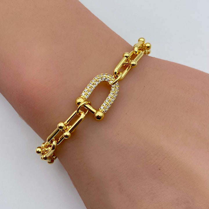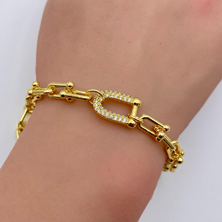 At its center, a sparkling U-shaped link is encrusted with dazzling micro-crystals, bringing a touch of refined brilliance that catches the light from every angle. The unique link construction not only ensures durability but also adds an upscale edge to your jewelry collection.