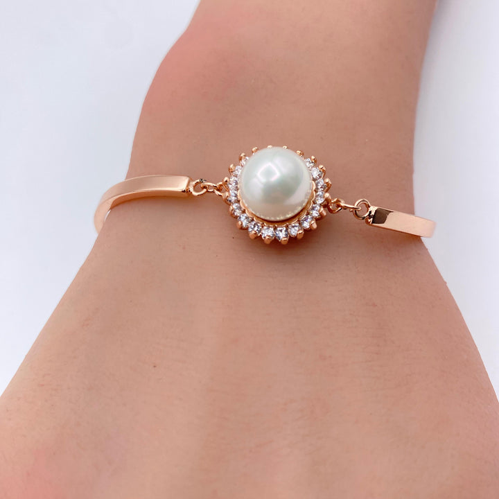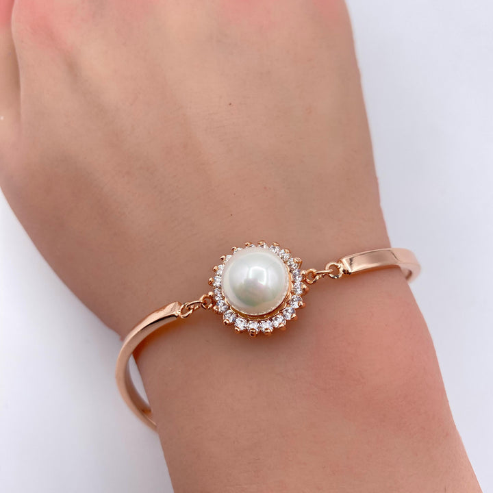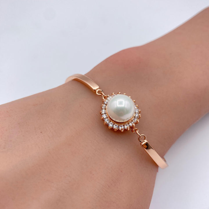 Enhance your wrist with our Pearl Rosegold Bracelet. Its elegant design features a lustrous pearl set in a rose gold bracelet, adding a touch of sophistication to any outfit. Made with high-quality materials, this bracelet is a must-have for any jewelry collection.
