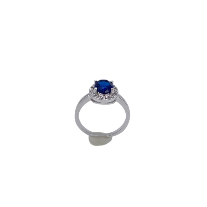 At the heart of this design lies a deep midnight-blue sapphire simulant, expertly cut and polished to mirror the rich beauty of natural gemstones. The centerpiece is encircled by a brilliant halo of dazzling white stones, creating a radiant contrast that captures light from every angle.