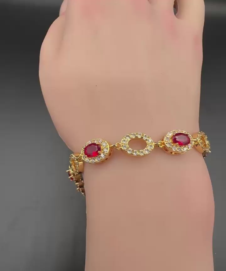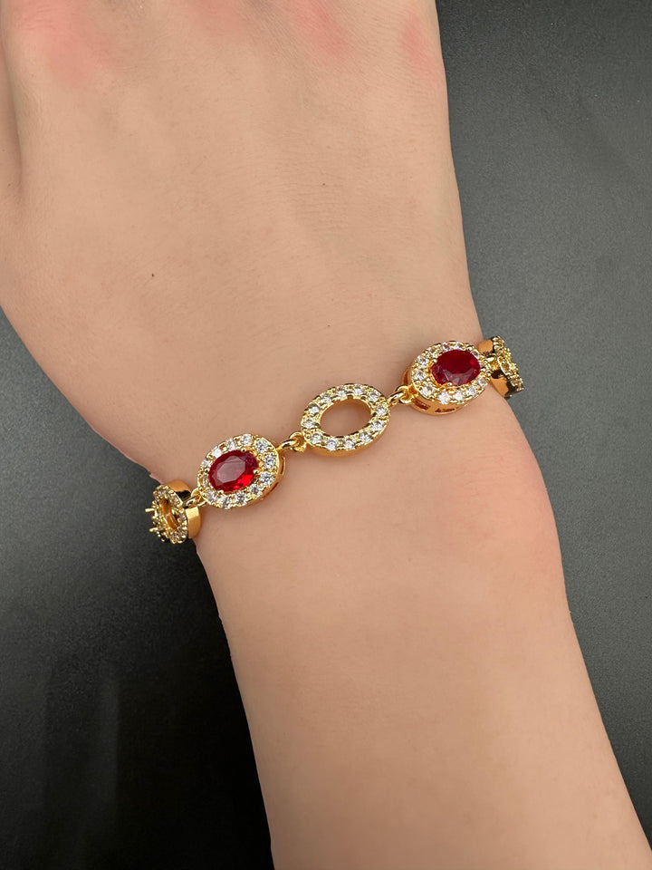 Elevate your style with this exquisite Ruby & Diamond Halo Bracelet, crafted in gold-tone brilliance. Each oval link alternates between deep red ruby-inspired gemstones and open diamond-encrusted loops, creating a luxurious rhythm of color and sparkle. The vivid red stones are framed with shimmering white stones, enhancing their richness and fire.