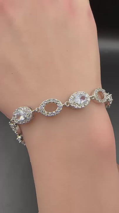 Elevate your elegance with this timeless white sapphire bracelet, crafted to perfection. Each oval link alternates between sparkling white sapphires and open halo designs, surrounded by a delicate frame of shimmering cubic zirconia for added brilliance.