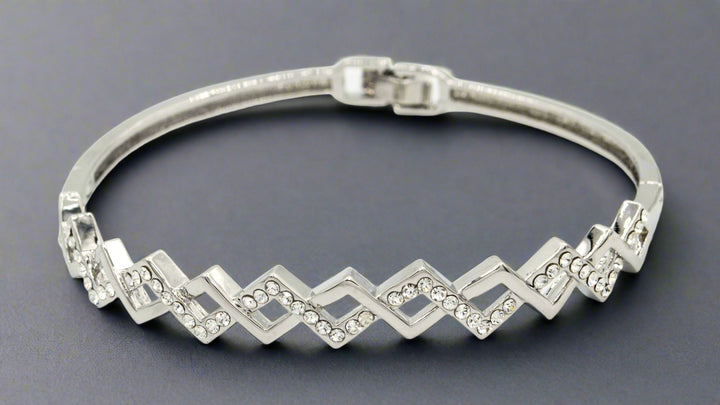 Make a bold statement with our Zigzag Sparkle Cuff, a contemporary twist on classic elegance. This silver-toned bracelet features an eye-catching zigzag design, embellished with clear, brilliant crystals that shimmer with every movement. The angular pattern gives it a modern edge, while the smooth metallic finish ensures timeless versatility.
